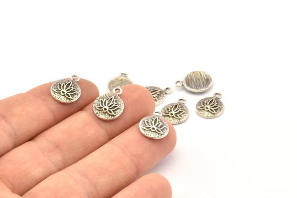 Lotus Flower Charm, 8 Antique Silver Plated Brass Lotus Flower Charms, With 1 Loop, Earrings, Findings (10mm) N0880