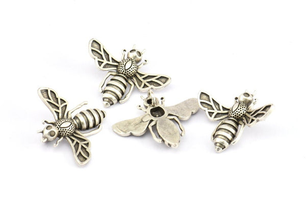 Silver Bee Pendant, 4 Antique Silver Plated Brass Bee Charm With 1 loop, Pendant (21x24mm) E585 H0032