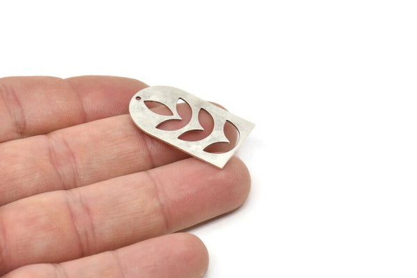 Antique Silver Plated Brass D Shaped And Leaf Patterned Charms With 1 Hole