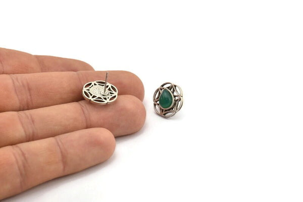 Antique Silver Plated Brass Flower Stud Earrings With 1 Drop Shaped Stone - Pad Size 8x6mm