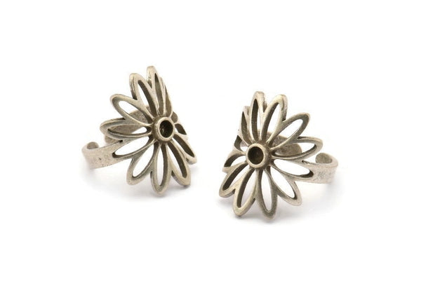 Silver Flower Ring, Antique Silver Plated Brass Flower Rings With 1 Stone Settings - Pad Size 3mm N1849 H1490