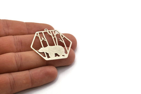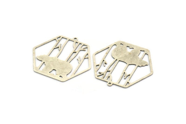 Antique Silver Plated Brass Bear Patterned Hexagon Shaped Charms With 1 Loop
