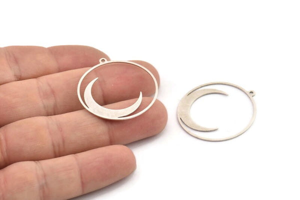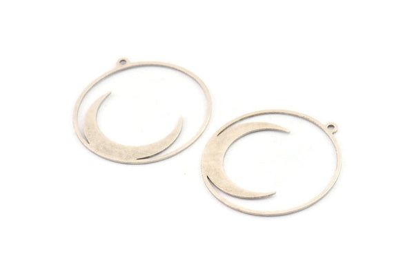 Silver Moon Charm, 4 Antique Silver Plated Brass Round Shaped Charms With 1 Loop, Round Charms, Pendants, Findings (32x30x0.60mm) A6279
