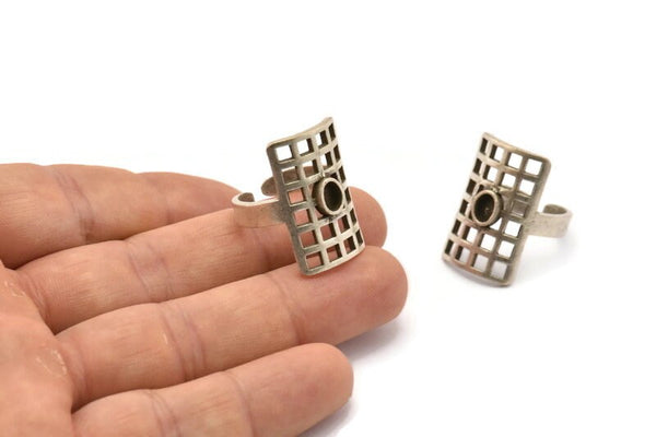 Silver Ring, Antique Silver Plated Brass Rectangle Ring With 1 Stone Settings - Pad Size 5x4mm N1846 H1538