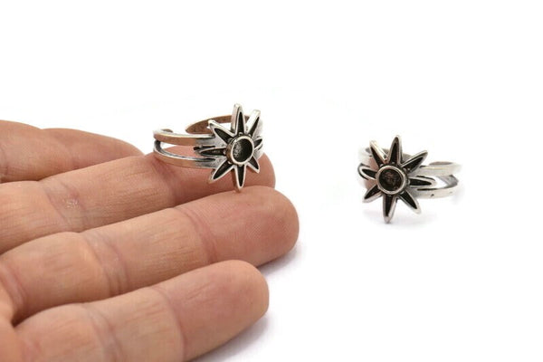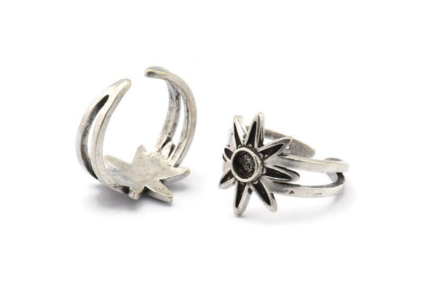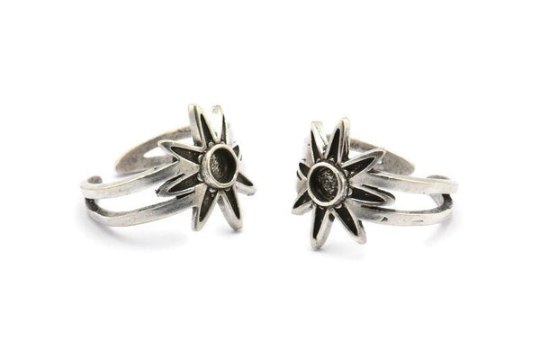 Silver Ring Setting, 2 Antique Silver Plated Brass Flower Ring With 1 Stone Settings - Pad Size 4mm N2007 H1460