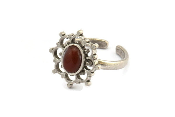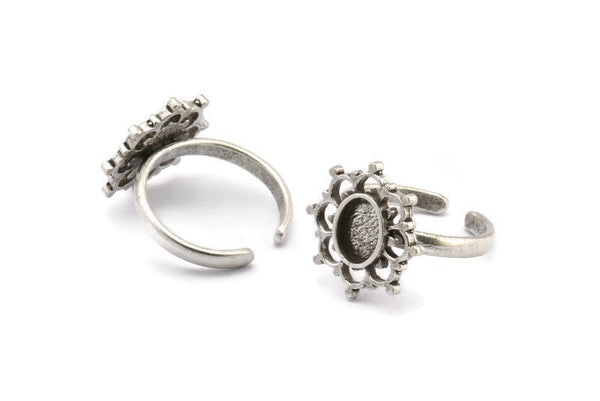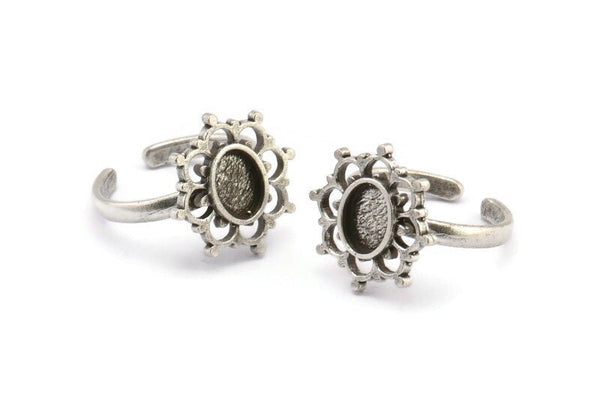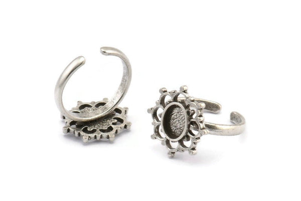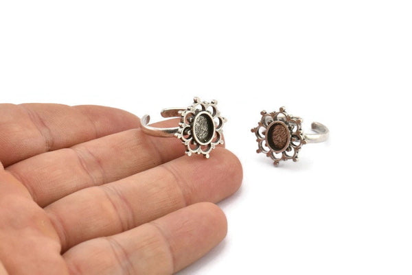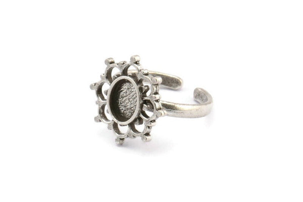 Antique Silver Plated Brass Flower Rings With 1 Oval Shaped Stone Setting - Pad Size 8x6mm