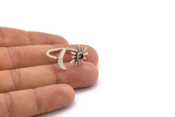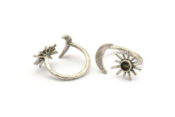 Antique Silver Plated Brass Moon And Sun Ring With 1 Stone Setting - Pad Size 4mm