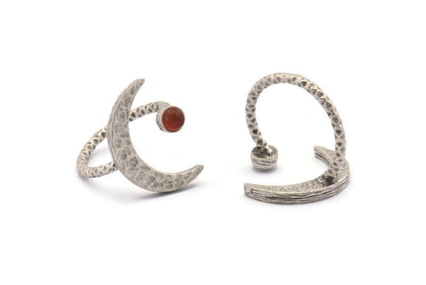 Hammered Antique Silver Plated Brass Moon And Planet Ring With 1 Stone Setting - Pad Size 4mm