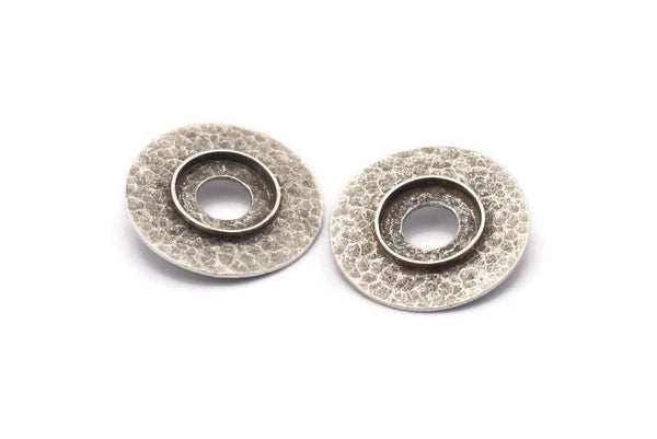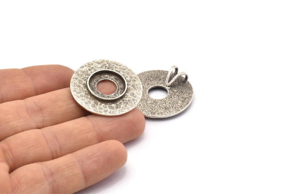 Antique Silver Plated Brass Hammered Round Pendant With 15mm Stone Pad