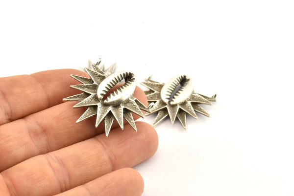 Antique Silver Plated Brass Cowrie Shell Pendants With 2 Loops