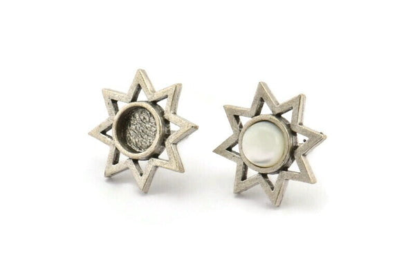 Antique Silver Plated Brass Star Stud Earrings With 1 Round Shaped Stone - Pad Size 6mm