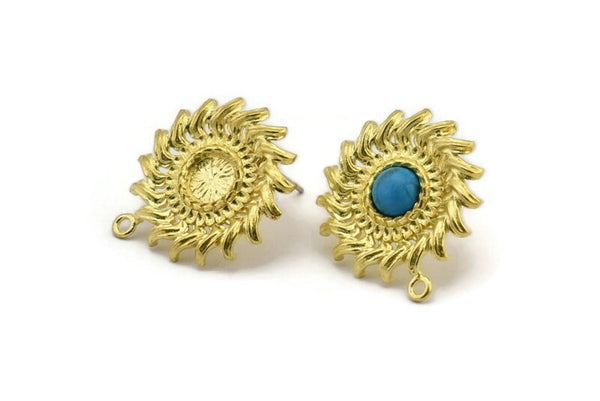 Brass Sun Earring, 2 Raw Brass Sunshine Stud Earrings with 6mm Stone pad, with 1 Loop (25x22mm) N0856