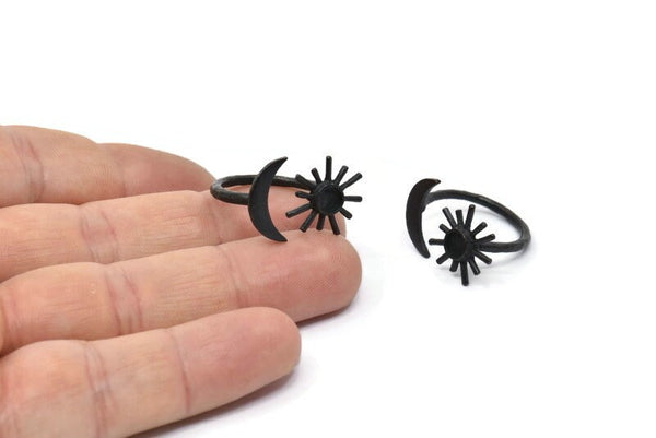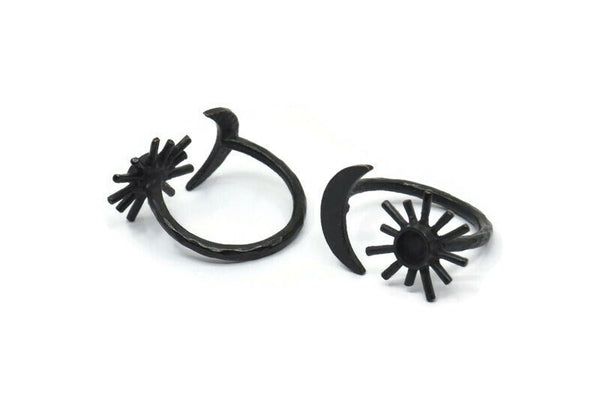 Black Ring Settings, 2 Oxidized Black Brass Moon And Sun Ring With 1 Stone Setting - Pad Size 4mm N1066
