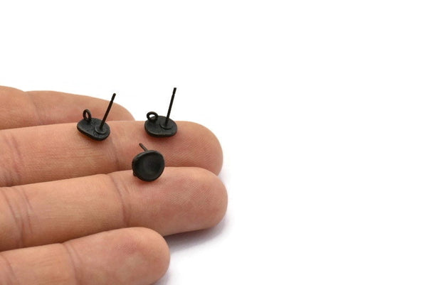 Black Round Earring, 6 Oxidized Black Brass Round Earring Studs, With 1 Loop (8mm) N1168 S649