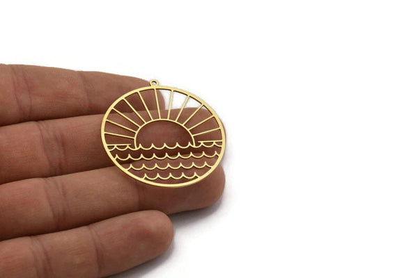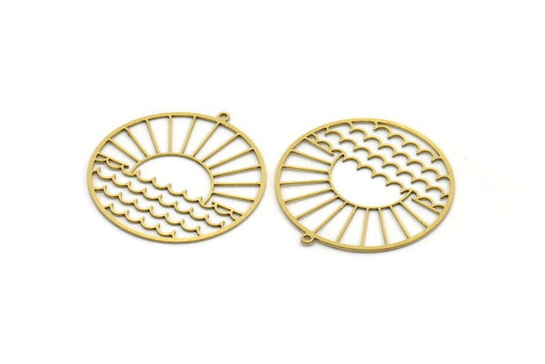 Raw Brass Rising Sun And Wavy Patterned Round Shaped Charms With 1 Loop