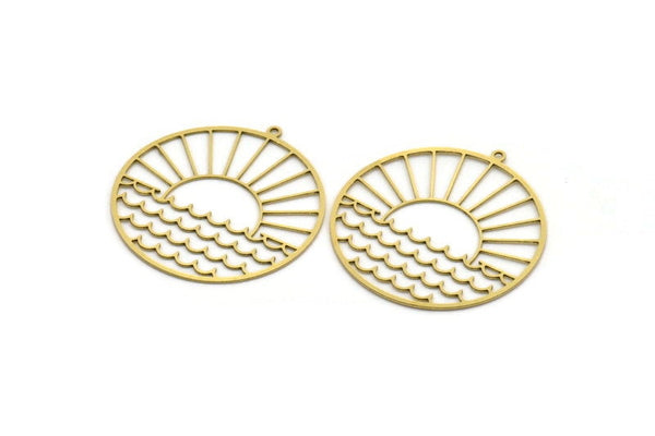 Brass Round Charm, 2 Raw Brass Rising Sun And Wavy Patterned Round Shaped Charms With 1 Loop, Charm Pendants (41x39x0.60mm) A6465