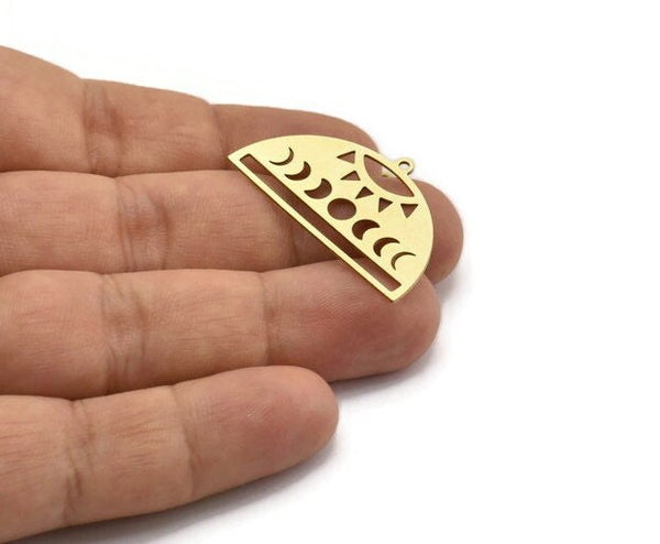 Semi Circle Charm, 4 Raw Brass Moon Phases Patterned Sun Shaped Charms With 1 Loop, Charms, Findings (20x36x0.60mm) A6420