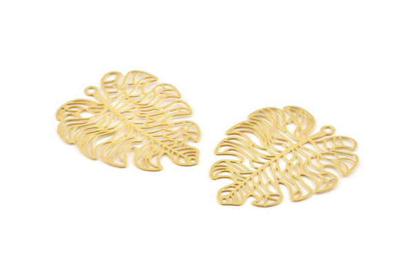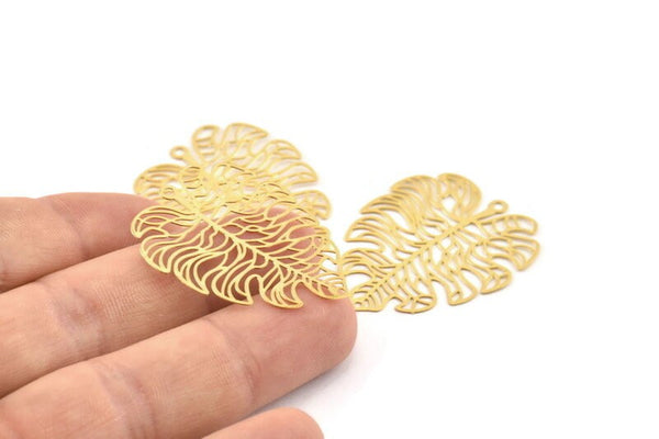 Gold Leaf Charm, 4 Gold Plated Brass Leaf Charms, With 1 Loop And 1 Hole, Findings (35x29x0.30mm) D1671