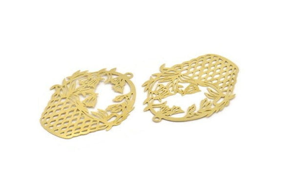 Brass Basket Charm, 4 Raw Brass Basket Shaped And Leaf Pattern Charms With 1 Loop, Charm Pendants (56x41x0.40mm) A5368