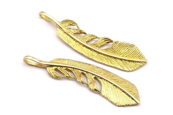 Raw Brass Feather Charms, Feather Pendants