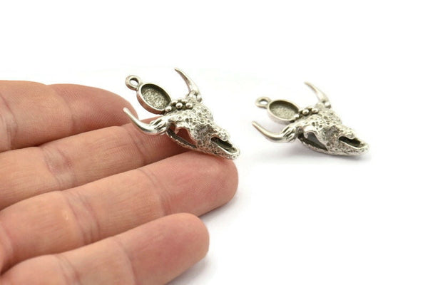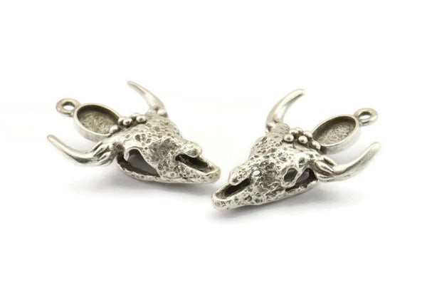 Antique Silver Plated Brass Ox Head Skull Charms With 1 Loop - Pad Size : 6x8mm