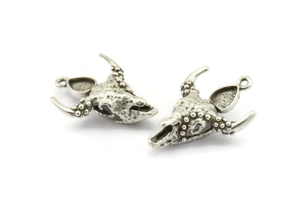 Antique Silver Plated Brass Ox Head Skull Charms With 1 Loop - Pad Size : 6x8mm