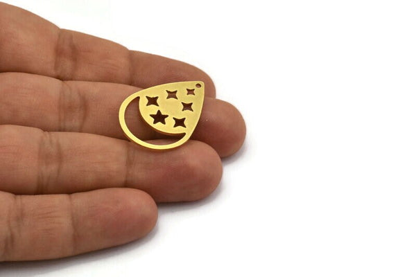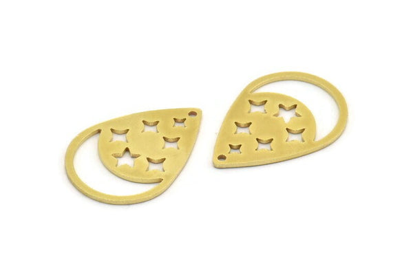 Raw Brass Moon And Star Patterned Drop Shape Charms With 1 Loop