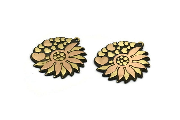 Brass Flower Charm, Raw Brass And Raw Copper Flower And Hearts Charms With 1 Loop, Copper Charms, Copper Findings (29.5x27x1.5mm) N2259