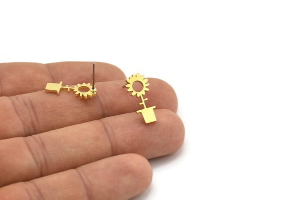Brass Flower Earring, 10 Raw Brass Sunflower Shaped Stud Earrings (18x9x1mm) A3761