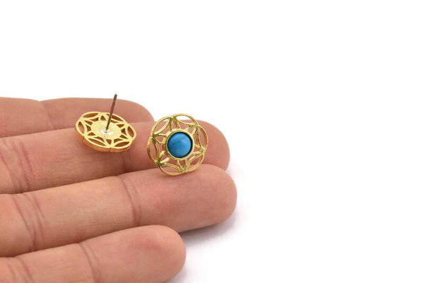 Raw Brass Flower Stud Earrings With 1 Round Shaped Stone - Pad Size 6mm