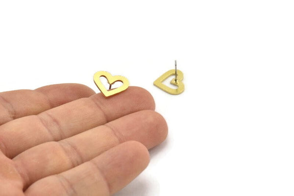 Brass Heart Earring, 8 Raw Brass Heart Shaped Stud Earrings (14x12x1mm) A3800