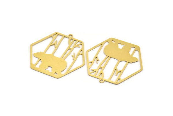 Raw Brass Bear Patterned Hexagon Shaped Charms With 1 Loop