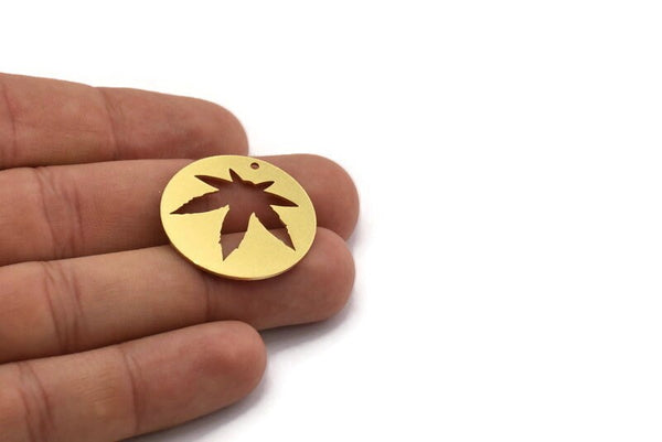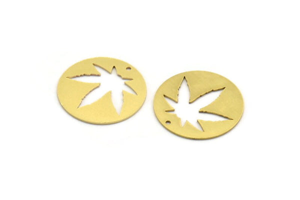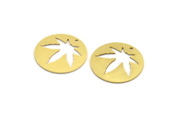 Brass Leaf Charm, 6 Raw Brass Leaf Patterned Round Shaped Charms With 1 Hole, Earring Charm Findings (28x0.80mm) A5544