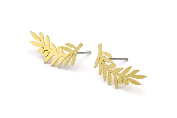 Brass Leaf Earring, 10 Raw Brass Branch Shaped Stud Earrings, Findings (22x10x0.60mm) A3026