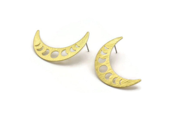 Brass Moon Earring, 4 Textured Raw Brass Crescent Moon Phases Stud Earrings (36x9x0.80mm) M01454 A5573