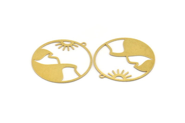 Brass Round Charm, 4 Raw Brass Sun And Mountain Patterned Round Shaped Charms With 1 Loop, Earring Findings (40x38x0.60mm) A4874