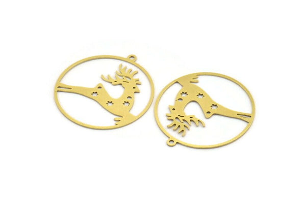 Raw Brass Deer Patterned Round Shaped Charms With 1 Loop