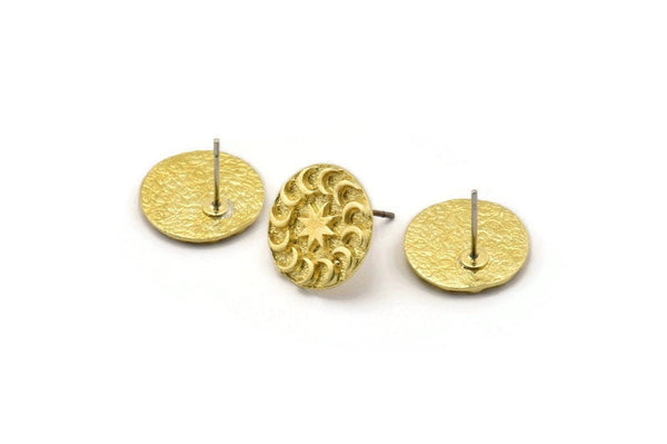 Brass Round Earring, 4 Raw Brass Star And Crescent Shaped Round Stud Earrings (14x1.4mm) N1867