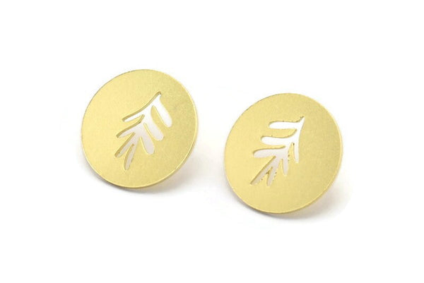 Brass Round Earring, 8 Raw Brass Branch Patterned Round Shaped Stud Earrings (18x0.80mm) A2792