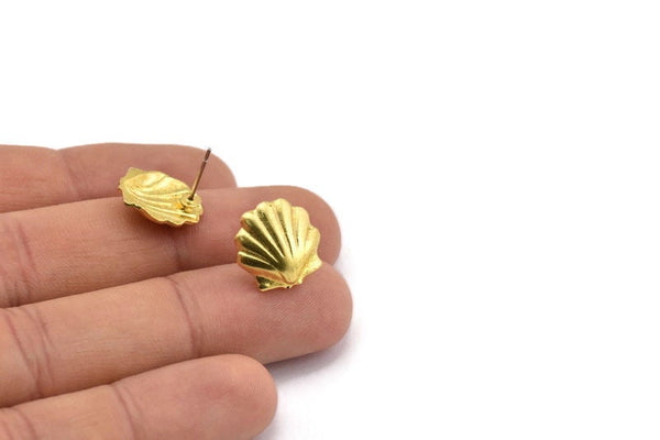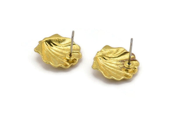 Brass Shell Earring, 4 Raw Brass Sea Shell Stud Earrings (15x14mm) N0944