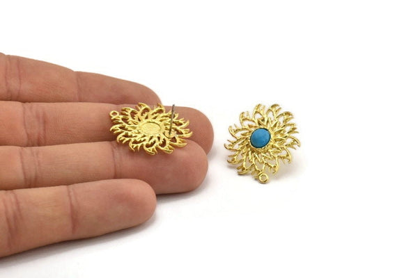 Raw Brass Sunshine Stud Earrings with 6mm Stone pad, with 1 Loop