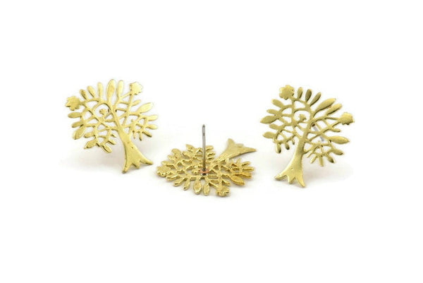 Brass Tree Earring, 6 Raw Brass Tree Stud Earrings (21x0.85mm) N1133
