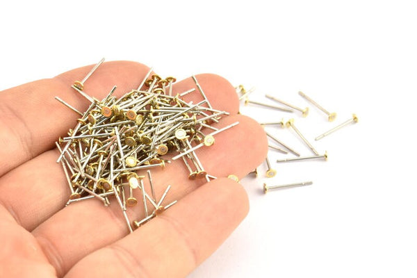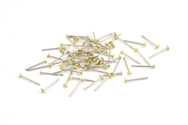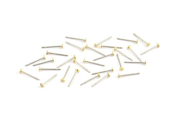 Stainless Steel Earring Posts With Raw Brass 2.5mm Flat Pad, Ear Studs