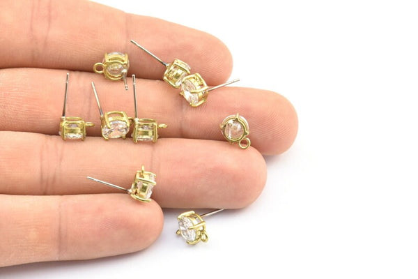 Earring Post Stud, 4 Stainless Steel Earring Stud With Raw Brass Pad And 7mm Zirconia Bead And 1 Loop, Ear Studs E098