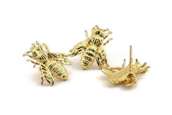 Gold Bee Earring, 2 Gold Plated Brass Bee Stud Earrings (22x20mm) N0916