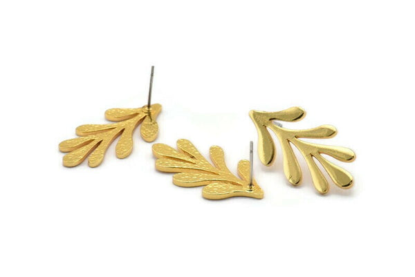 Gold Leaf Earring, 2 Gold Plated Brass Leaf Stud Earrings (29x15x1.50mm) N1711