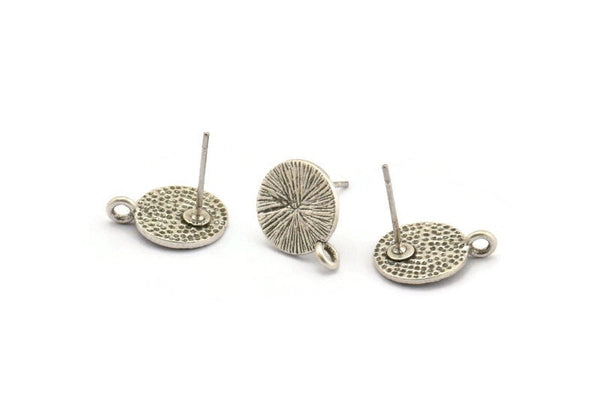 Silver Earring Posts, 4 Antique Silver Plated Brass Round Earring Stud, Earring Charms With 1 Loop (10mm) N0793