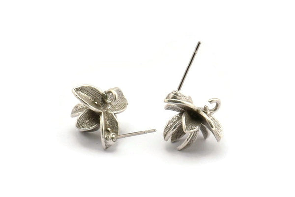Silver Flower Earring, 2 Antique Silver Plated Brass Flower Stud Earrings With 1 Loop (15x14mm) N1204