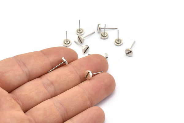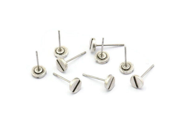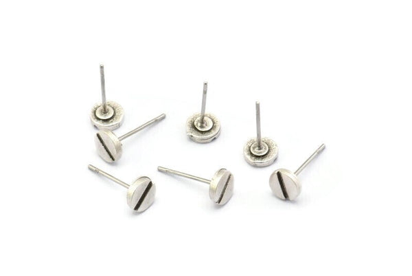 Silver Round Earring, 12 Antique Silver Plated Brass Screw Shape Round Stud Earrings (6x1.2mm) N1652