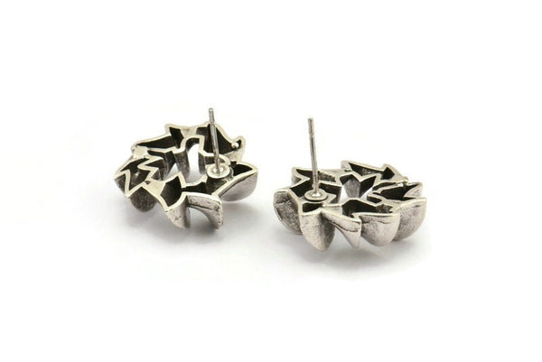Silver Round Earring, 2 Antique Silver Plated Brass Round Stud Earrings (20x19mm) N2144